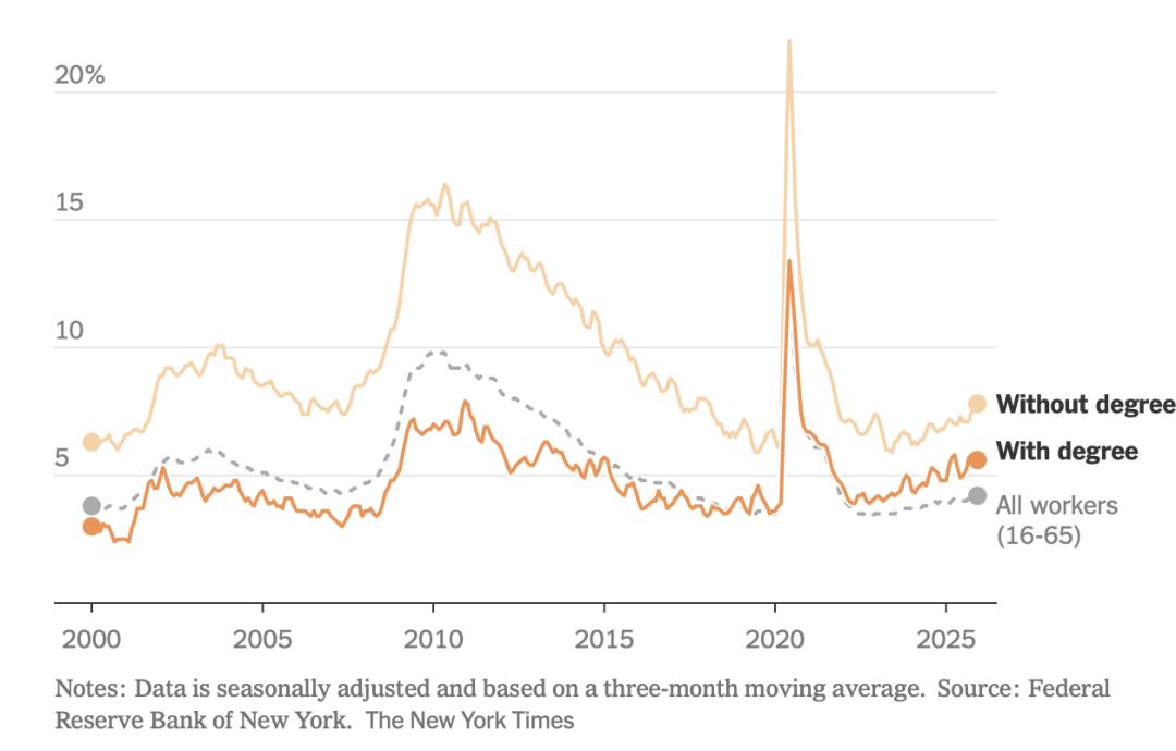 纽约联邦储备银行的数据显示,去年底,22 至 27 岁大学毕业生的失业率飙升至 5.6%,远超整体失业率。