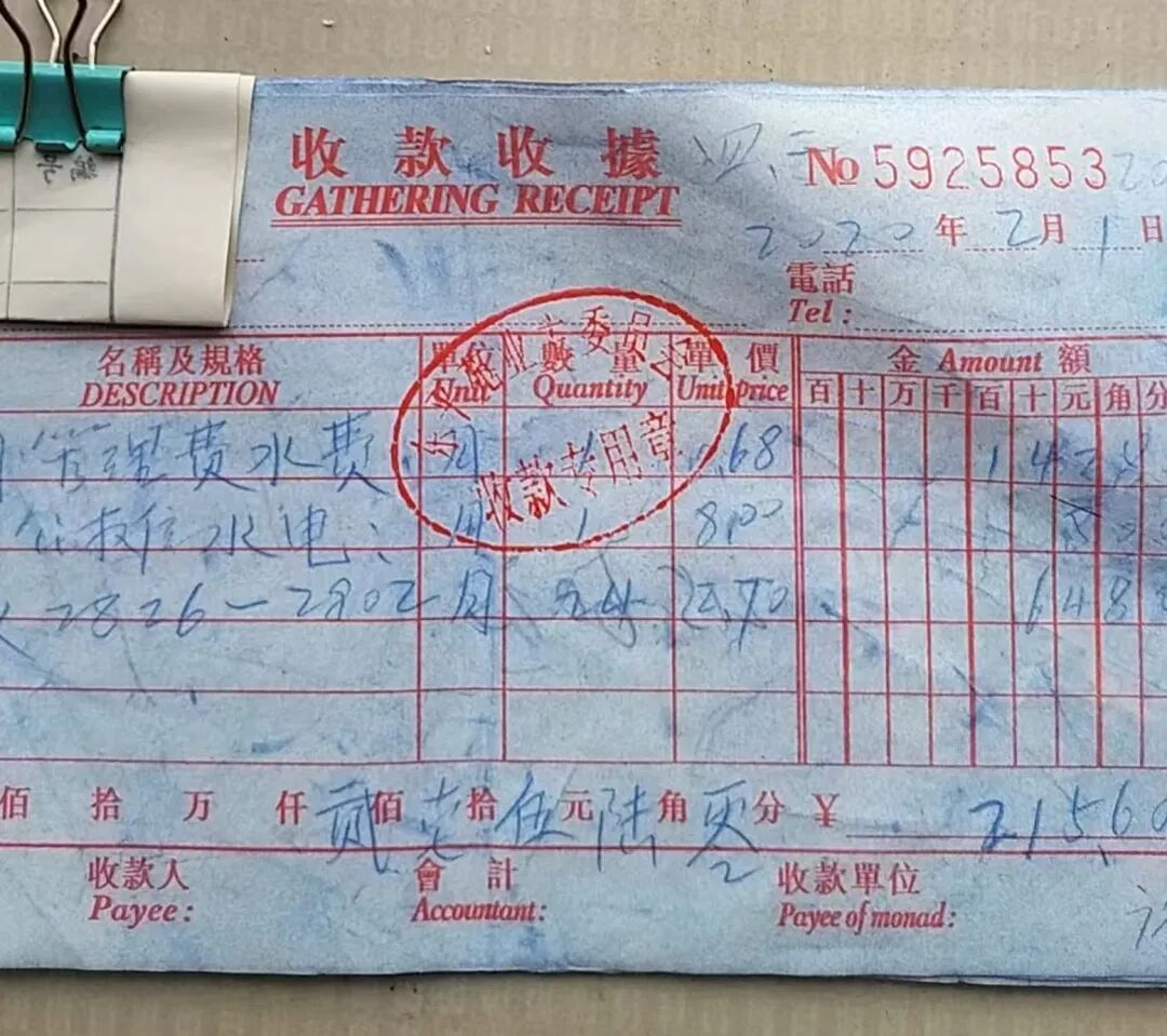2269天过去,杨女士还留着那张物业费收据。这是她最后一次缴费,时间定格在2020年2月1日。