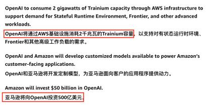 更关键的是,OpenAI承诺在AWS上消耗约2GW的Trainium算力,这极大地加速了亚马逊自研芯片的规模化进程。全球最顶尖的两家模型公司,正在一起把亚马逊的云、平台和芯片体系往上抬。