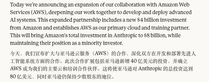 2024 年 11 月,亚马逊再追加 40 亿美元,总额拉到 80 亿美元,Anthropic 又进一步把 AWS 定为首选训练合作伙伴。