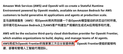 进入2026年2月,亚马逊宣布对OpenAI进行高达500亿美元的投资,并使AWS成为OpenAI企业平台的“独家第三方云分发合作伙伴”。这一步的意义,不是“又投了一家公司”,而是亚马逊开始从一家模型阵营的受益者,变成整个AI基础设施世界里的总入口。