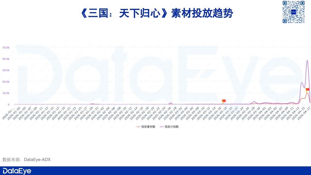 DataEye-ADX投放数据显示,《三国:天下归心》从今年一月份起进行素材投放,但整体素材投放量并不突出,在游戏上线当天才迎来提升。