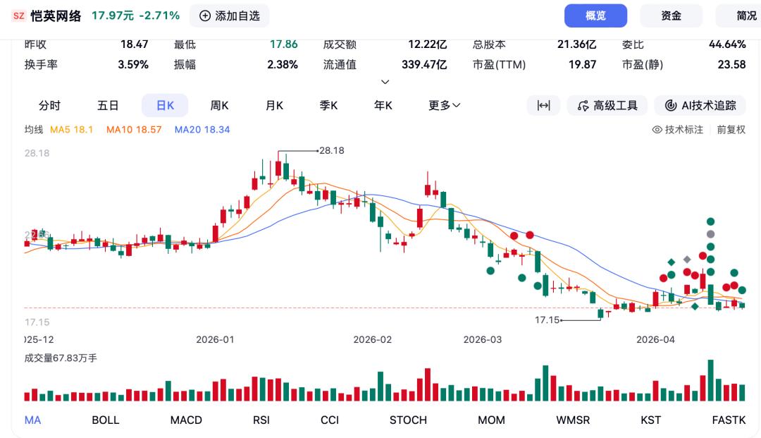 4月13日,恺英网络股价直接跌停,收盘价锁定在18.17元,跌幅10.00%,总市值缩水至388.2亿元。背后核心诱因是机构资金集中出逃,市场悲观情绪蔓延。龙虎榜数据显示,三家机构席位合计净卖出3.39亿元,深股通也净卖出5819万元,多重资金出逃直接引发市场恐慌性抛售。