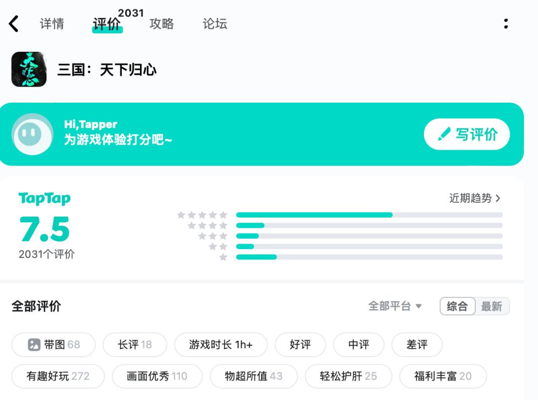 玩家评论方面,截至4月19日,产品在TapTap平台评分约为7.5分,且多数评论集中在「有趣好玩」「画面优秀」等标签。
