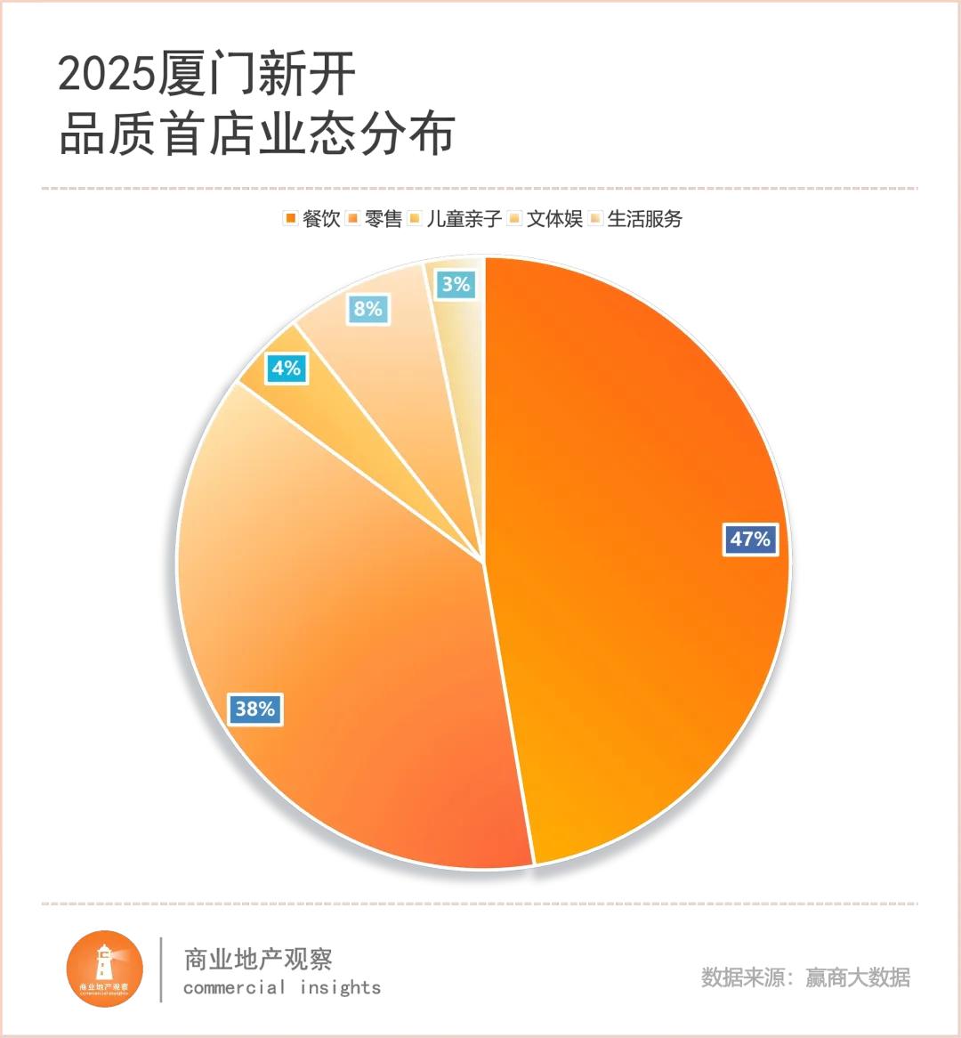 2025年厦门首店业态结构保持“餐饮为主、零售为辅、体验业态补充”的特征,与2023年、2024年的结构基本一致,但细分赛道创新特征明显。