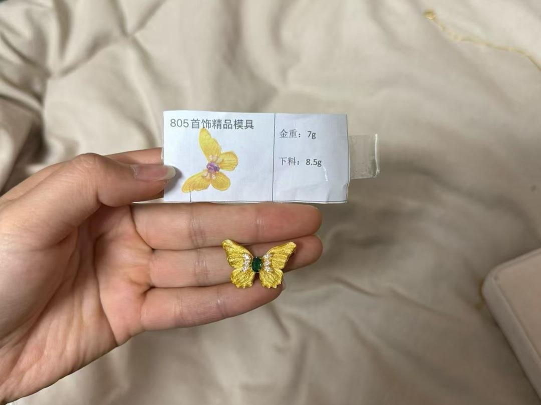 为省下手工费,丁丁融掉了一件旧金饰,花一两个小时打出一款8.5克的蝴蝶结项链,还镶嵌了一枚绿宝石。