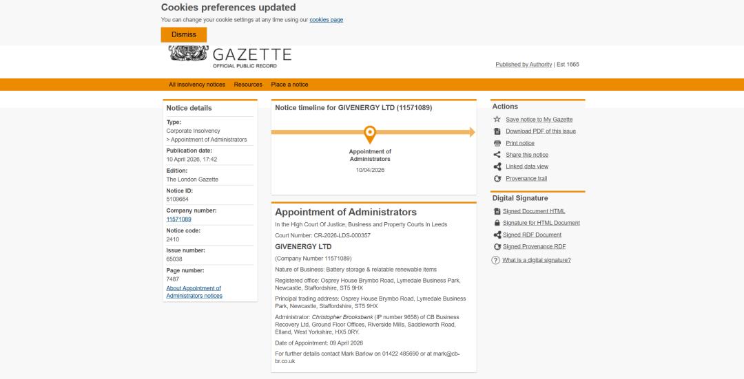然而,就在思格上市的一周前,4月9日,曾经的英国户储巨头——GivEnergy,正式进入破产管理程序。