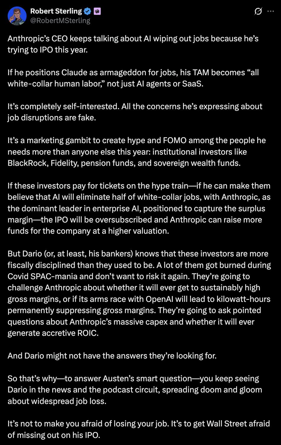Dario Amodei不断描绘一个岗位大面积蒸发的未来,像是在敲响警钟: