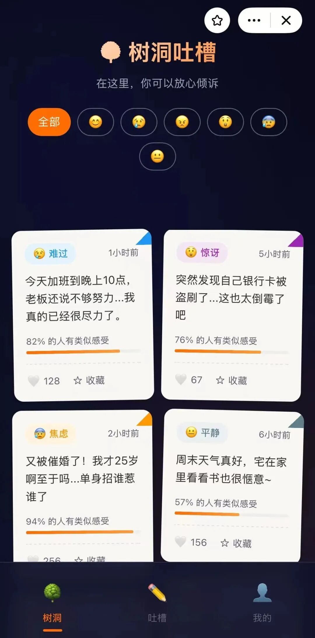 比如,一个叫做“匿名树洞吐槽”的小应用,界面上都是小便利贴形式的吐槽:“加班到10点还被老板PUA”,“25岁就被催婚至于吗”,而每条贴士上还会标注XX%的人有类似感受,这个比例是随着大家的点赞实时变化的,如果你也有共鸣,就为它点个赞,把这条吐槽顶到前排。