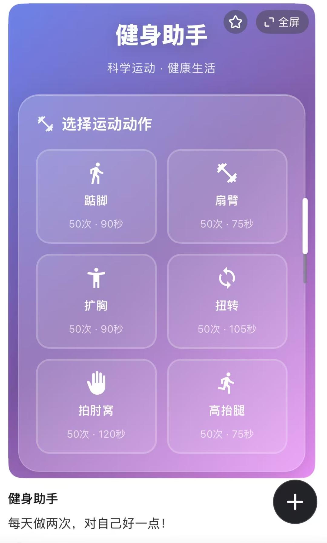 有久坐不动的办公室打工牛马,为了提醒自己时不时起来活动活动,搞了一个“健身助手”,敦促大家每日完成6个基础又简单的动作;