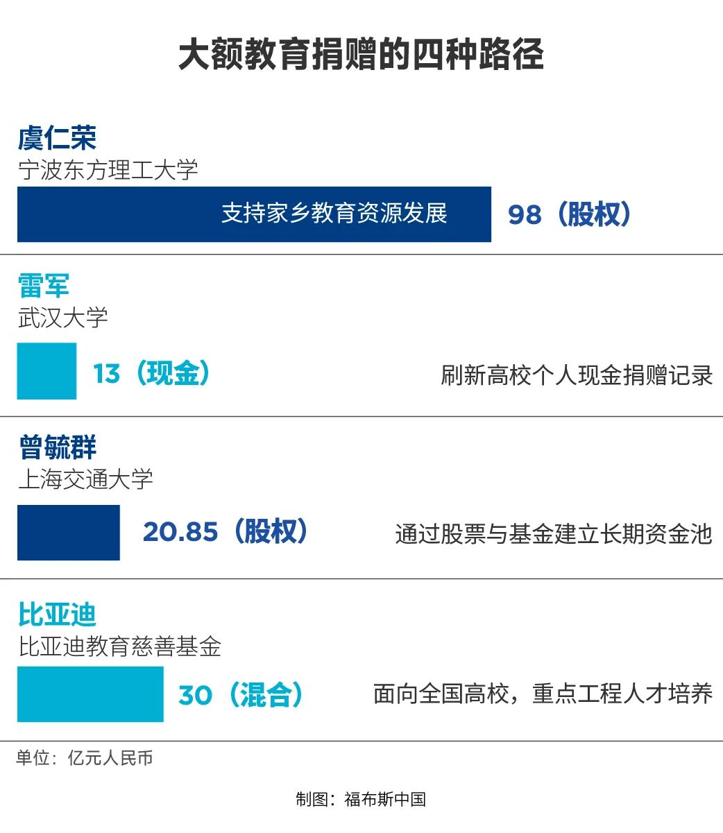 从头部样本看,中国大额教育捐赠已经分化出几种清晰路径:面向单一高校长期建设的投入,校友对母校的高额回馈,以股票和基金支持学校的资产型捐赠,以及由企业主导、面向更广泛教育体系的平台型慈善。头部捐赠者不仅贡献了大部分金额,也在塑造这类捐赠的主要模式。