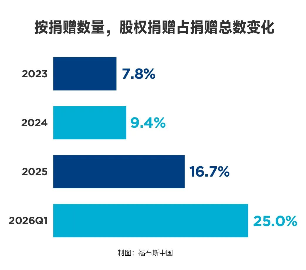 但从金额和头部案例看,股权捐赠的存在感正在上升。数据中共有22笔可明确识别的股权捐赠,占笔数的14.2%,对应金额约162.17亿元,占总额的48.5%。更重要的是,股权捐赠的占比在近几年持续抬升:按笔数看,2023年为7.8%,2024年为9.4%,2025年升至16.7%,2026年截至一季度已达25.0%。