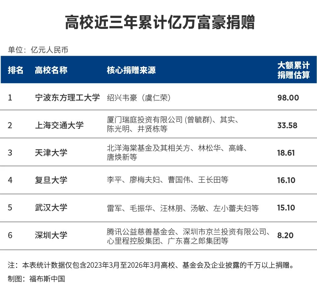 福布斯中国梳理了2023年3月至2026年3月高校、基金会及企业披露的数百条千万以上捐赠记录,在剔除超过数据考察期的累计披露与证据不足样本后,得到155笔来自亿万富豪或他们关联企业的有效捐赠,合计约334亿元。资金并非均匀流入教育体系,而是集中流向头部高校和长期基金平台。这种集中背后,不只是资金分布的变化,更是捐赠逻辑的改写:出资端正在由新经济资本接管,教育捐赠本身也在从一次性回馈转向长期布局。