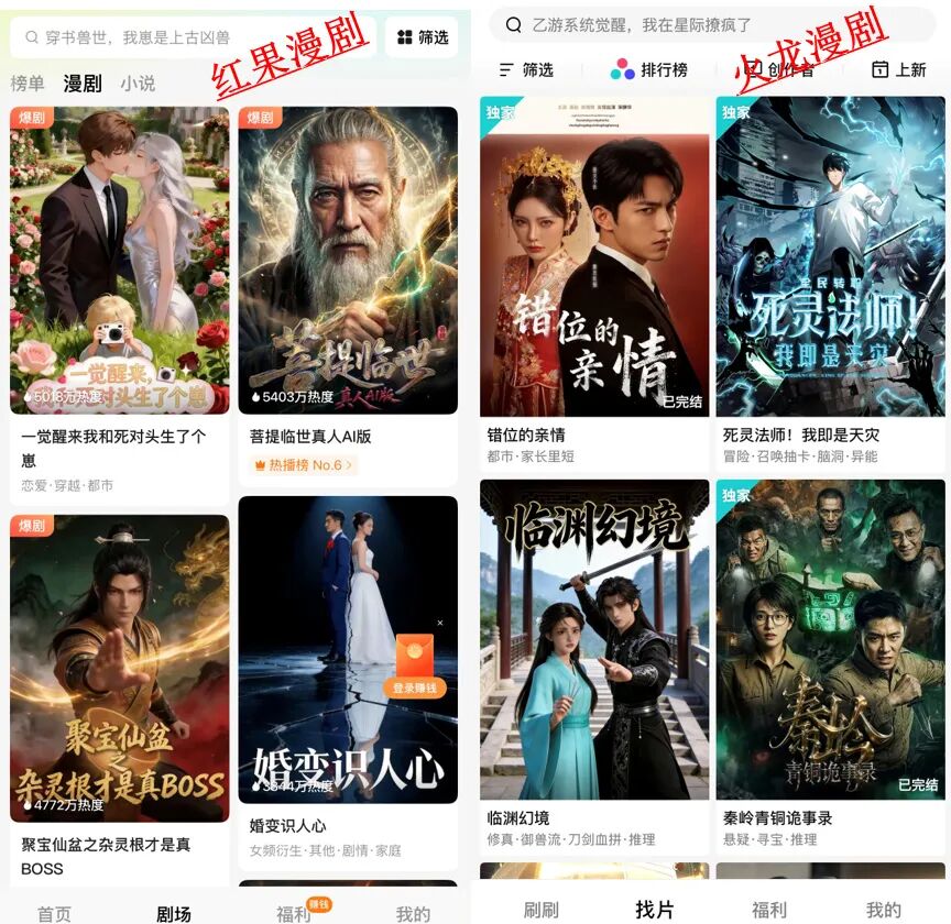 在红果短剧的部分热度榜单上,漫剧已能占到超过三分之一。比如4月20日的新剧榜单,《彪悍人生:从制霸高原开始》《聚宝仙盆之杂灵根才是真BOSS》《云浮梦若归》《被三叔辜负后,我怒闯大海成渔王》等漫剧热度均超过5000万,排名前40的新剧里有15部是AI漫剧。