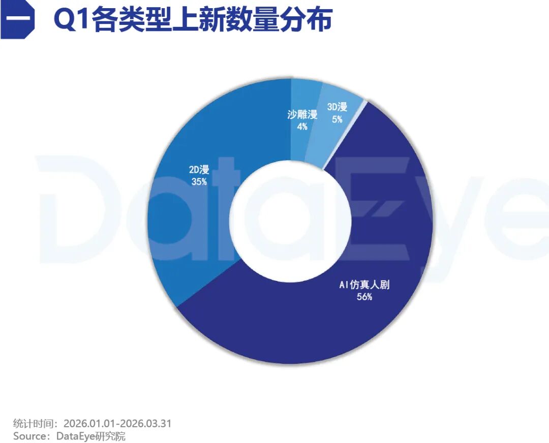 据DataEye发布的《2026年Q1 AI剧及漫剧数据报告》,以抖音端为例,2026年以前在播漫剧为5.8万部,2026年第一季度增长至约18万部,单3月就新增了约5万部漫剧;2026年第一季度的新增漫剧中,占比最高的类型为AI仿真人剧(56%),2D漫排名第二(35%),其余为3D漫(5%)、沙雕漫(4%)等。
