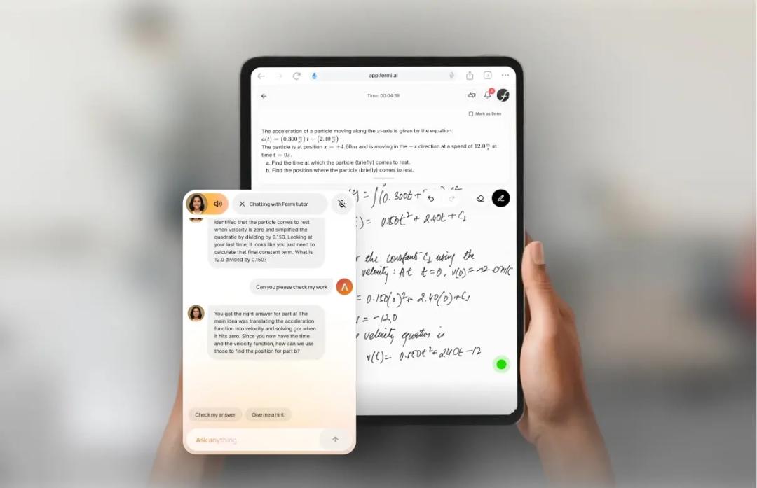 与欧美这两家被动转型形成对比的是新加坡的 Fermi.ai。Fermi.ai 将全球总部设于新加坡,目前已率先在美国和印度落地产品,首批上线数学、物理、化学三大 STEM 核心学科,精准切中了中学生理科学习的刚需市场。不同于市面上多数专注快速解题的 AI 教育工具,Fermi.ai 清晰定位于「AI 学习导师」,核心服务覆盖学生与教育工作者两大群体,构建起从学习练习到教学诊断的全链路解决方案。创始人 Peeyush Ranjan 是前谷歌副总裁,他创立 Fermi.ai 的出发点是对当下 AI 教育工具的批判:「AI 让困难的事情变得简单易行,但除非得到正确使用,否则这种化繁为简会阻碍学习。」