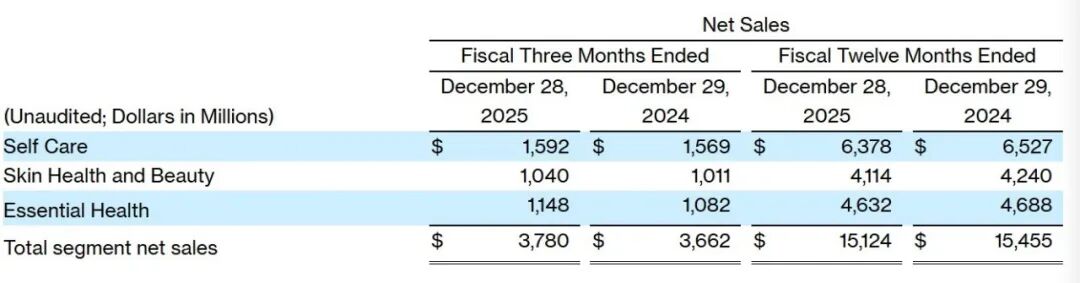 到了2025年,其全年净销售额为151.2亿美元(约合人民币1031亿元),同比下滑2.1%,有机销售额同比下降2.2%。从业务板块看,三大板块均下滑,其中皮肤健康与美容业务下滑约3%至41.14亿美元(约合人民币280亿元)。