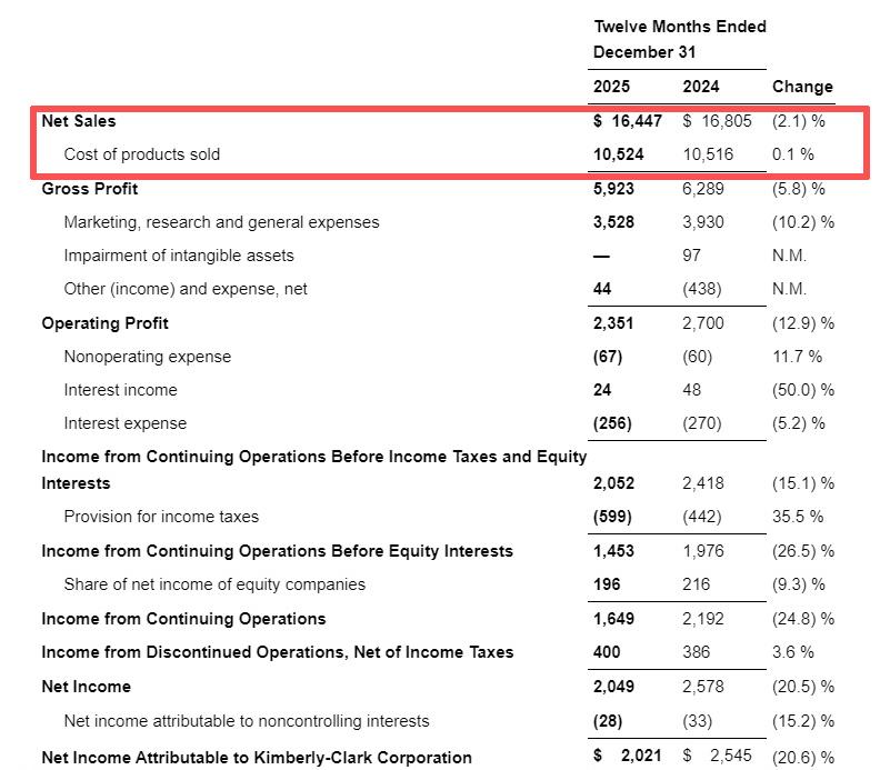 金佰利同样面临增长压力。其2022年-2023年,其净销售额保持在200亿美元(约合人民币1364亿元)上下,2024年下降至168亿美元(约合人民币1146亿元),而2025年,全年净销售额为164.47亿美元(约合人民币1122亿元),同比再次下降2.1%。