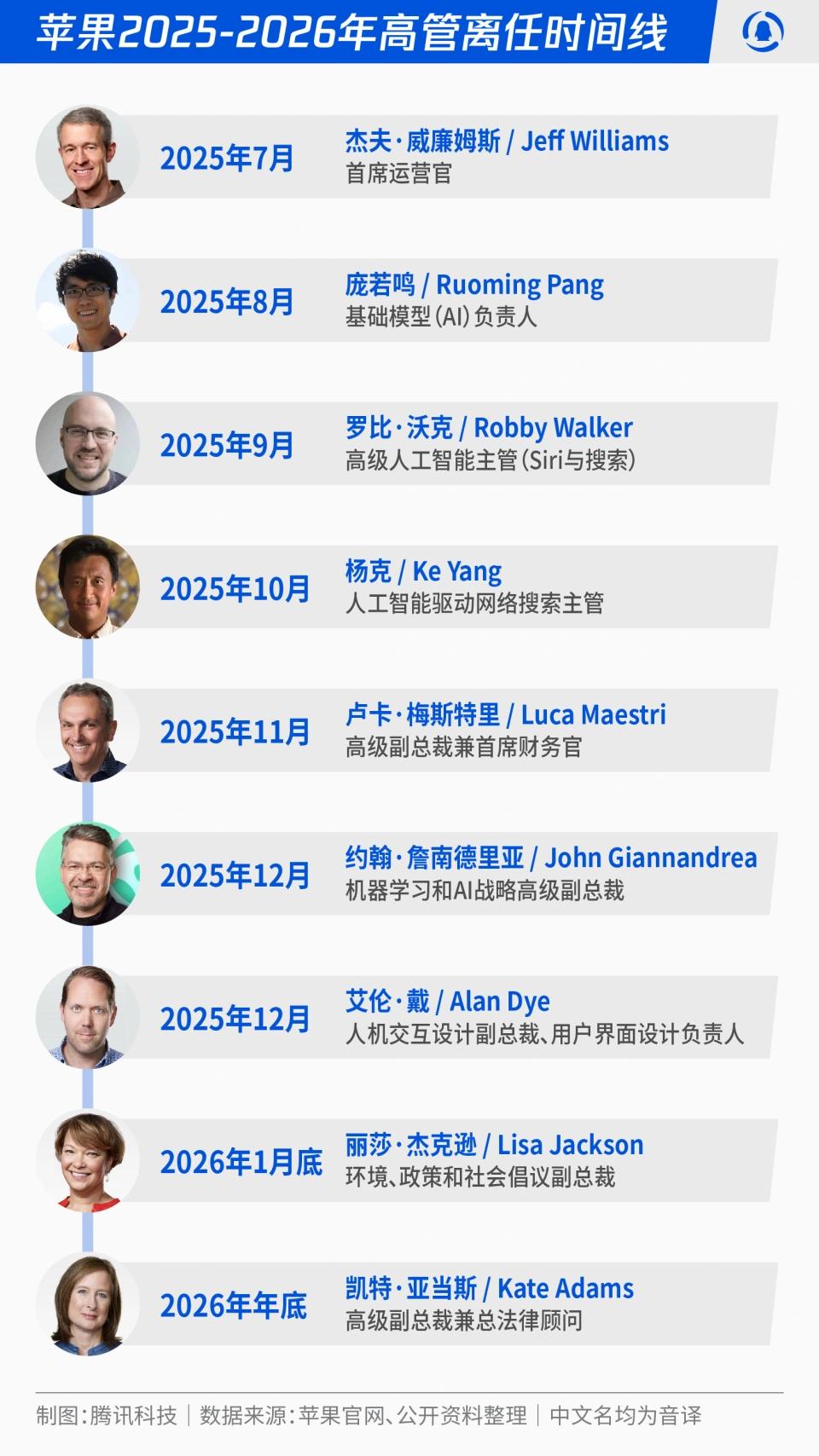 过去半年,苹果已将这场交接埋下伏笔。2025年底,首席运营官杰夫·威廉姆斯(Jeff Williams)退休,环境与政策事务负责人丽莎·杰克逊(Lisa Jackson)随后离任,数位库克时代的核心高管相继淡出。
