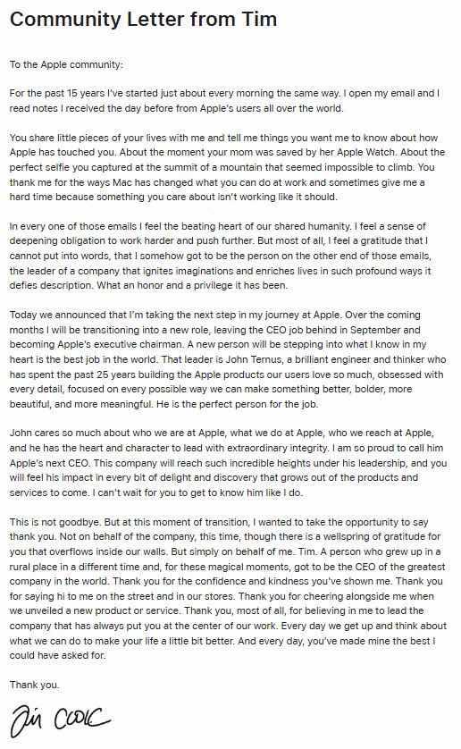感谢你们给予我的信任与善意;感谢你们在街上、在苹果门店里亲切与我问好;感谢我们发布新品新服务时,你们一路的欢呼与支持;最感谢的,是你们始终相信我,让我带领这家永远把用户放在首位的公司前行。 我们日复一日思索,只为尽力让你们的生活变得更美好一点;而日复一日,你们也成就了我此生最圆满的人生。 谢谢大家。