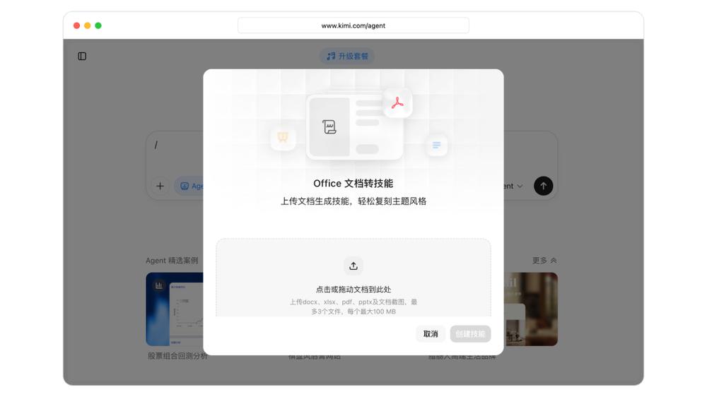 为了降低创建门槛,K2.6还推出了“Office文档转技能”功能,用户只需上传高质量文档,Kimi即可理解其结构与风格基因,自动生成专属的可复用文档创建技能。