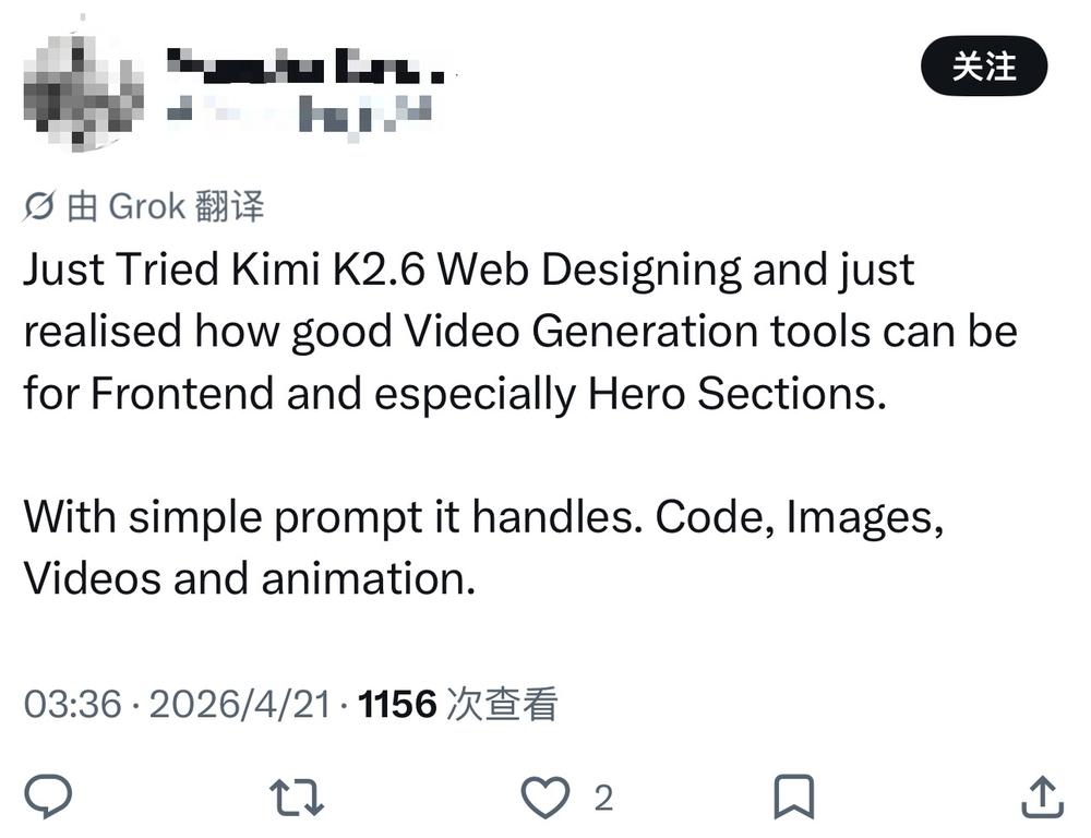 在海外,开发者对K2.6的反馈也十分积极。有开发者称,使用K2.6进行网页和前端交互设计“体验极佳,几乎是现阶段最佳”,能够轻松处理代码、图像、视频和动画素材。