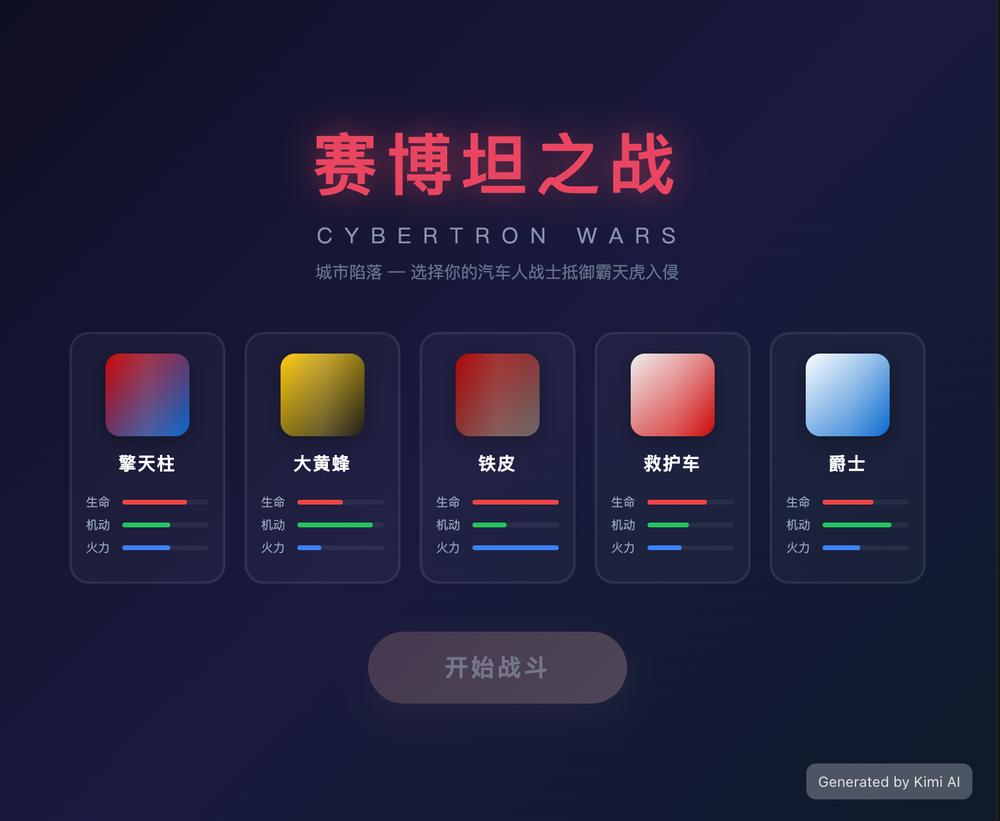 从实测结果来看,K2.6在游戏逻辑与元素还原上表现出色,提示词中要求的汽车、废墟等环境元素都有着不错的呈现,5种擎天柱阵营角色也如约而至。