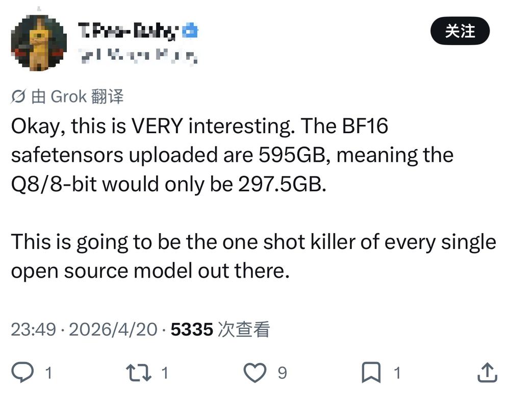 另一位开发者则关注到模型的BF16权重上传量为595GB,认为在开源生态中极具竞争力。