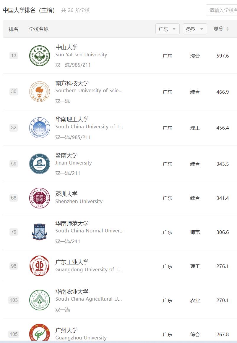 下图是软科评选的广东排名靠前的大学: