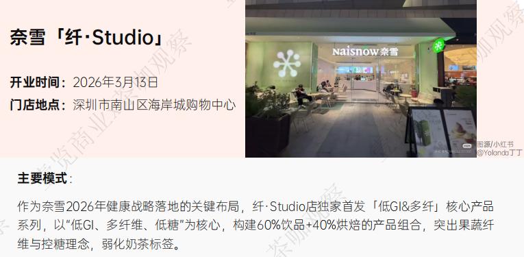•奈雪「纤・Studio」落地深圳:3月13日,奈雪的茶在深圳海岸城推出全新店型“纤・Studio”,首发低GI&多纤系列产品,以“60%饮品+40%烘焙”组合切入健康赛道。核心产品如瘦瘦小绿瓶(GI值仅37)、半糖生甜甜圈(糖量减少50%以上)定价15-28元,同时推出鲜果咖啡、康普茶等新品类。这是奈雪继0卡糖、罗汉果糖后,在健康茶饮领域的又一次场景化深耕。