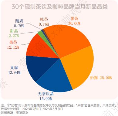 •当月新品概览:3月,30个品牌共推出132款新品(含回归产品),较2月大幅增加。品类结构上,奶茶以26.52%的占比位居首位,奶咖以25.00%紧随其后,两者合计过半;咖啡类(奶咖+果咖)合计占比38.64%。不含茶饮品占比18.94%,延续了品牌在茶咖基底之外的风味探索。