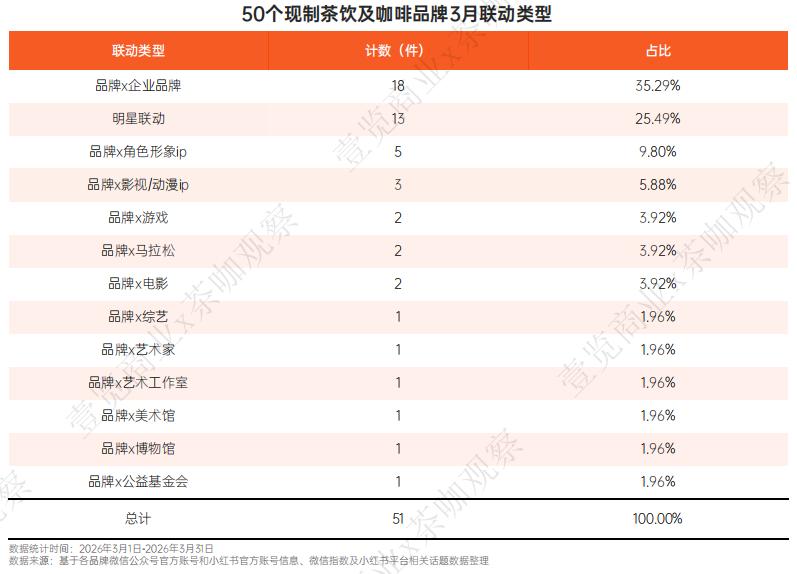 •联动形式多元:本月51起联动活动中,品牌×企业品牌18起,占比35.29%,多采用“抽奖互赠”轻量合作模式;品牌×文化/娱乐IP19起,占比37.25%,涵盖动漫、游戏、影视、博物馆等;明星联动13起,占比25.49%,幸运咖、LINLEE林里等偏爱轻量化明星合作。