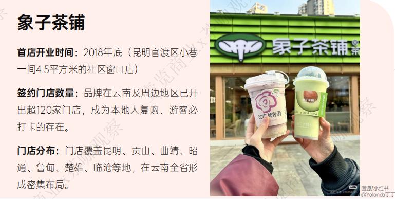 •云南区域品牌“象子茶铺”走红:成立于2018年的象子茶铺,本月因山野莓果系列12天售罄引发关注。品牌扎根云南,已开出超120家门店,招牌“牛油果酸奶巴旦木”累计销量超500万杯。产品单价15-20元,以酸角、树番茄、滇橄榄等云南山野食材为特色,门头融入扎染纹样,被网友称为“云南奶茶必打卡”。品牌坚持“直营+加盟”精细化运营,要求加盟商在装修期发布筹建内容以积累自然流量。