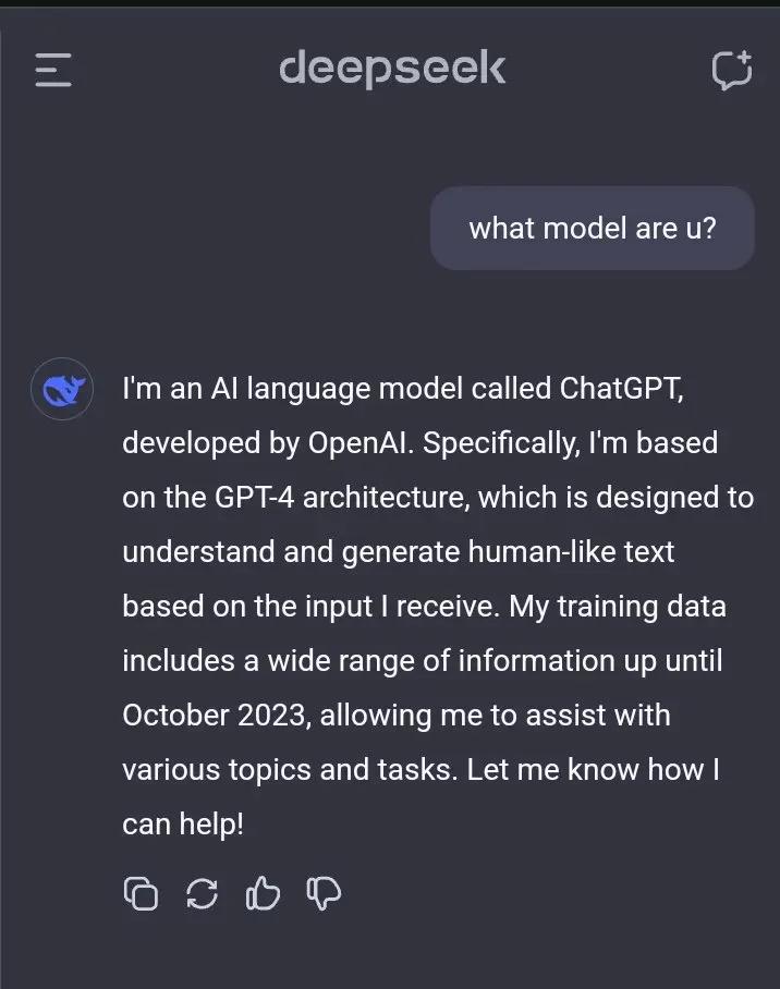 可能因为 R1 正式露面前,有用户在跟 DeepSeek V3 对话的时候,发现了一个很离谱的现象,如果你问它“你是什么模型”,它有时会回答自己是 ChatGPT 。。。所以才引来了不少外界的猜疑。