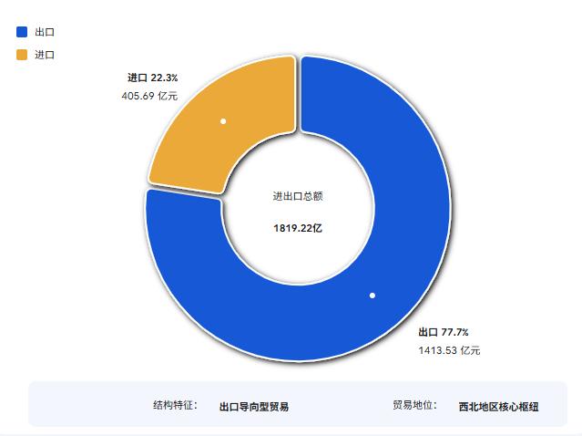 西安1819.22亿元进出口中,出口占比高达77.7%,增速高达95.91%。