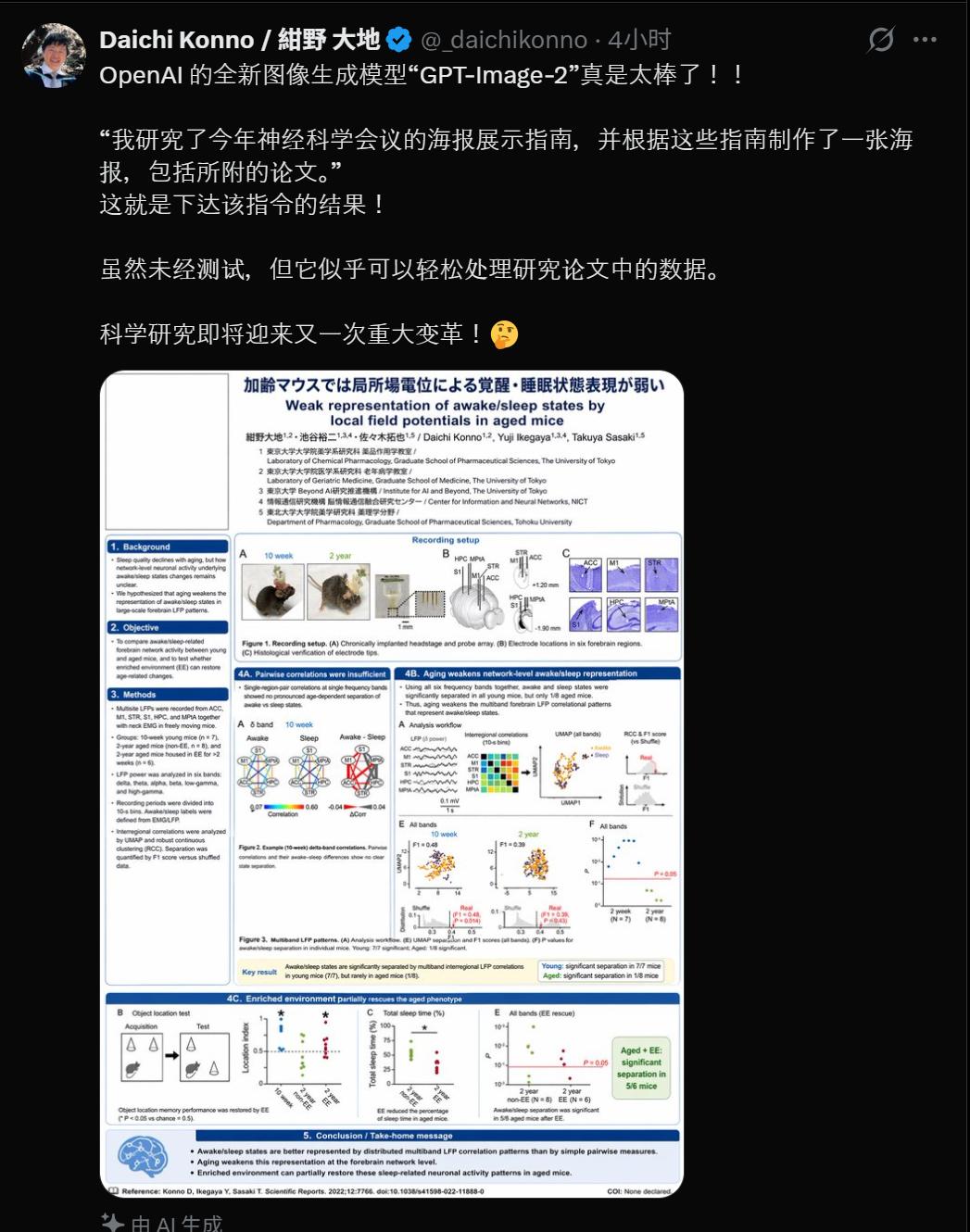 一位东京大学医学博士晒出了自己生成的论文海报,表示虽然还没有测试,但ChatGPT Images 2.0似乎可以处理论文中的数据,他惊呼科学研究即将迎来又一次变革。
