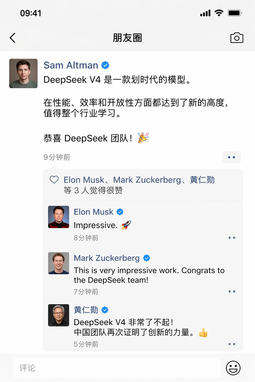 提示词:“一张微信朋友圈截图,Sam Altman发朋友圈称赞DeepSeek V4是一款划时代的模型,下面是马斯克、扎克伯格、黄仁勋的点赞和评论。”
