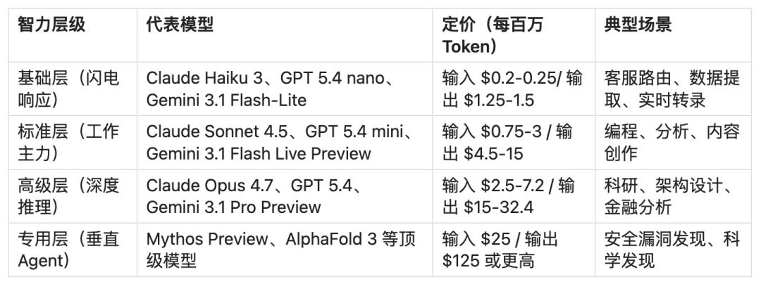 就像互联网时代的比特 (Byte) 取代了通信时代的通话次数,AI 时代词元 (Token) 正在取代比特成为新的流量基本单位。词元不度量“人看了什么”,而是度量“智能体完成了什么任务”。与互联网时代流量资费按 GB 一刀切不同,Token 经济学引入了按智力等级分层定价。以往通信技术从 1G 到 5G 迭代,5 级服务平摊到 25 年里提供。而 AI 大模型仅用约 4 年就实现了 4 级不同智力等级的词元服务,然后一起提供了出来。