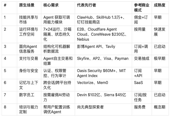 智能体及其网络运行本身所需的基础设施和服务,这些在 1.0 时代完全不存在的需求,正在催生至少八个智能体原生应用场景和新流量入口,每个入口都是 2.0 原生流量的来源:技能市场、工作环境、信息服务、支付和交易支持、身份和安全保障、记忆服务、数字员工、智能体培训,等等。