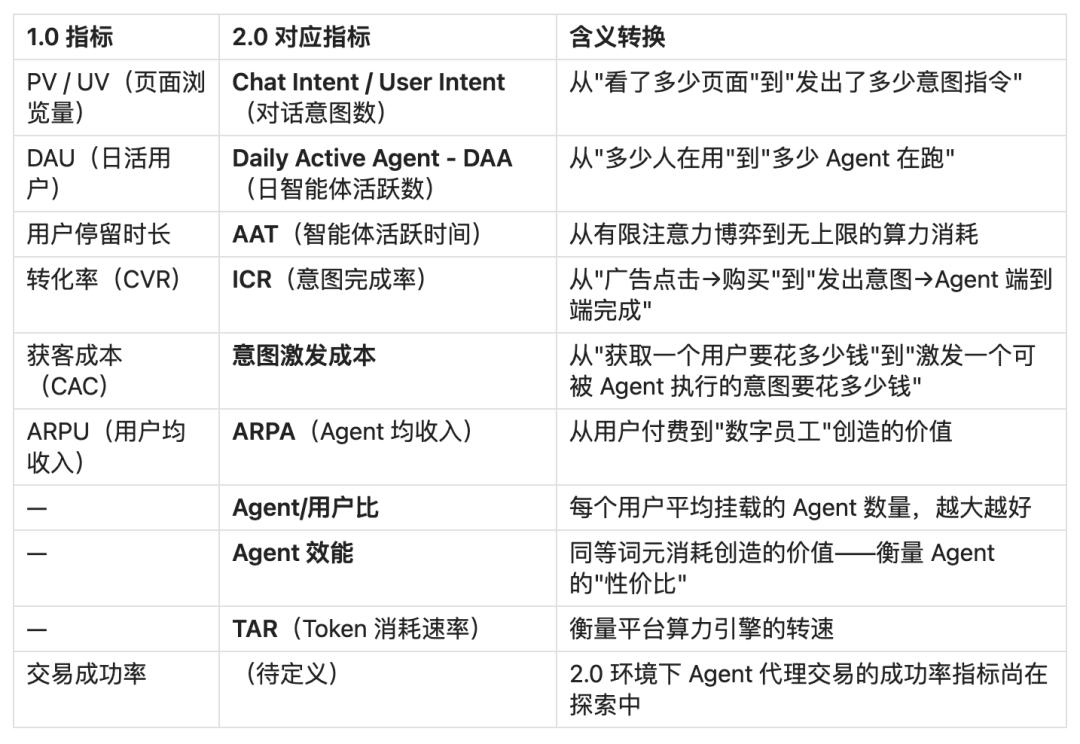 几个新指标的含义是:Chat Intent是 PV 的 2.0 对标物,从被动曝光计量变成主动意图表达,商业价值密度远高于 PV。意图激发成本是 CAC 的升级,核心挑战从获客变成激发可被智能体执行的明确意图。智能体/用户比是 2.0 独有的增长杠杆指标,一个用户可以创建多个 智能体并衍生子智能体,这个比值的增长速度可能是判断平台是否进入 2.0 增长曲线的关键先行指标。智能体效能衡量同等词元消耗下创造的价值,防止陷入“词元消耗量崇拜”。