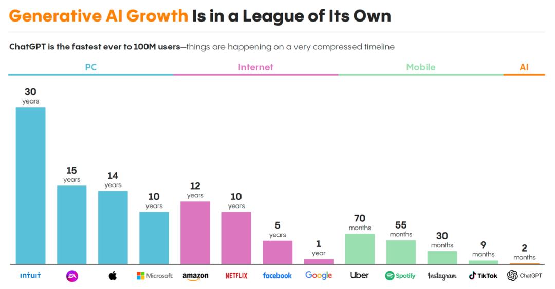 2022 年 11 月:ChatGPT 面世,人们习惯变了。OpenAI 发布 ChatGPT,两个月内用户突破 1 亿,成为历史上增长最快的消费级应用。它第一次让大众体验到“与 AI 自由对话”的神奇,将人们与 AI 交互的主要方式从点击屏幕正式升级为自然语言对话。截至 2026 年,ChatGPT 周活跃用户已超过 8 亿。