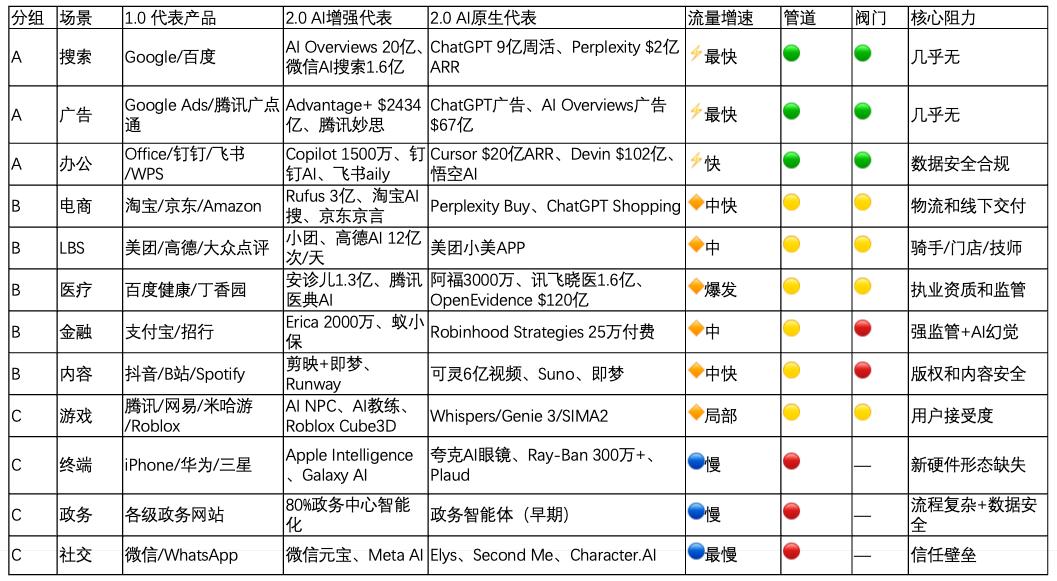 这六个场景的共同特征是:涉及线下服务商体系,或涉及版权保护、特殊或阶段性重点监管。这意味着即使 AI 技术已经达到应用水平,流量从 1.0 到 2.0 的转化速度仍受到非技术因素的制约。但阻力不等于阻断——这些场景的转化启动规模已经在扩大,局部已出现爆发。
