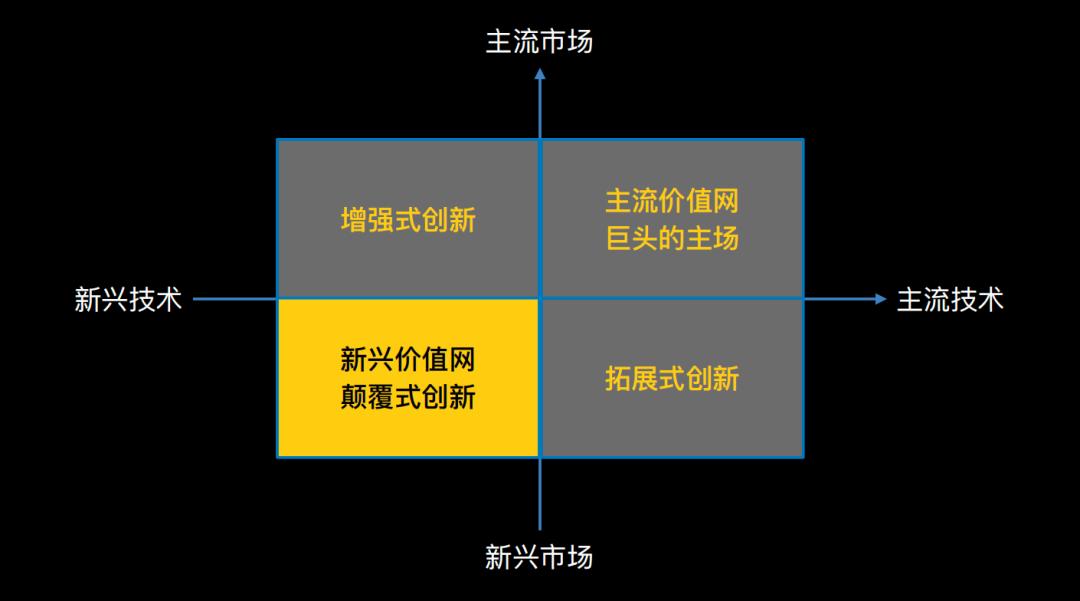 恰恰是第四象限,也就是:新技术×新市场。这是一条“两头不靠”的路,既没有成熟技术作背书,也没有成熟市场作支撑。