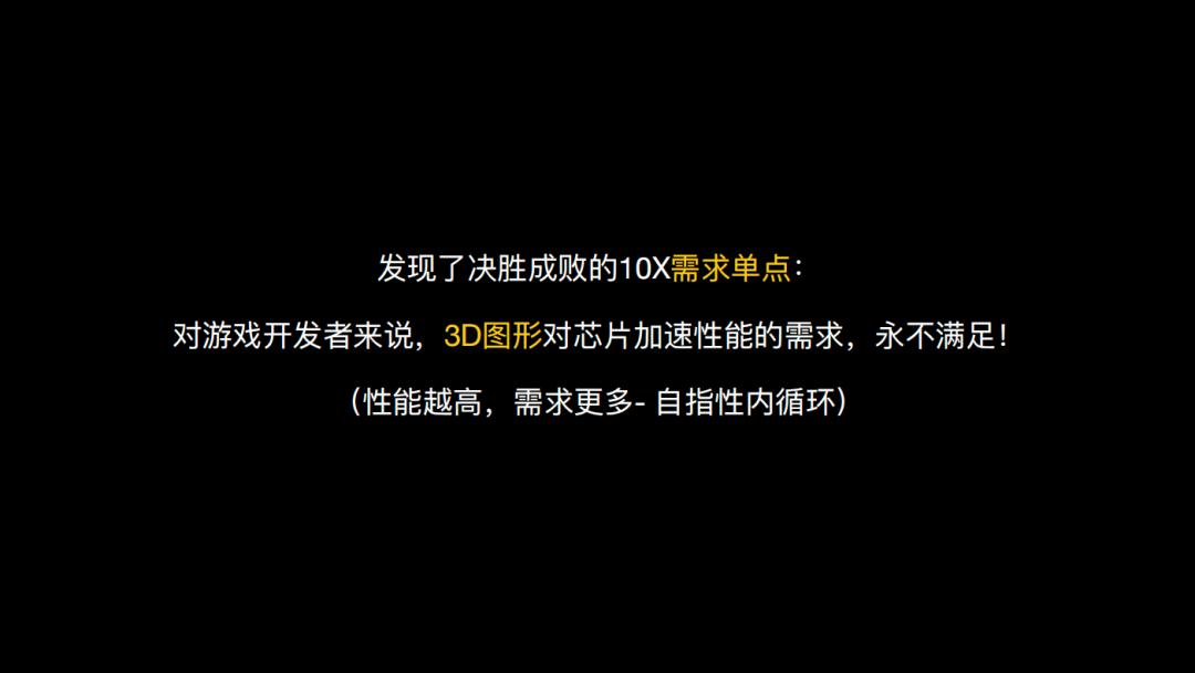 当时最火的游戏是《雷神之锤》。而这个领域中最伟大的开发者之一,就是它的首席程序员卡马克。黄仁勋当时的判断是:这是我们客户中最了不起的天才。那么,我就去问他:你有什么需求?我为你定制芯片。