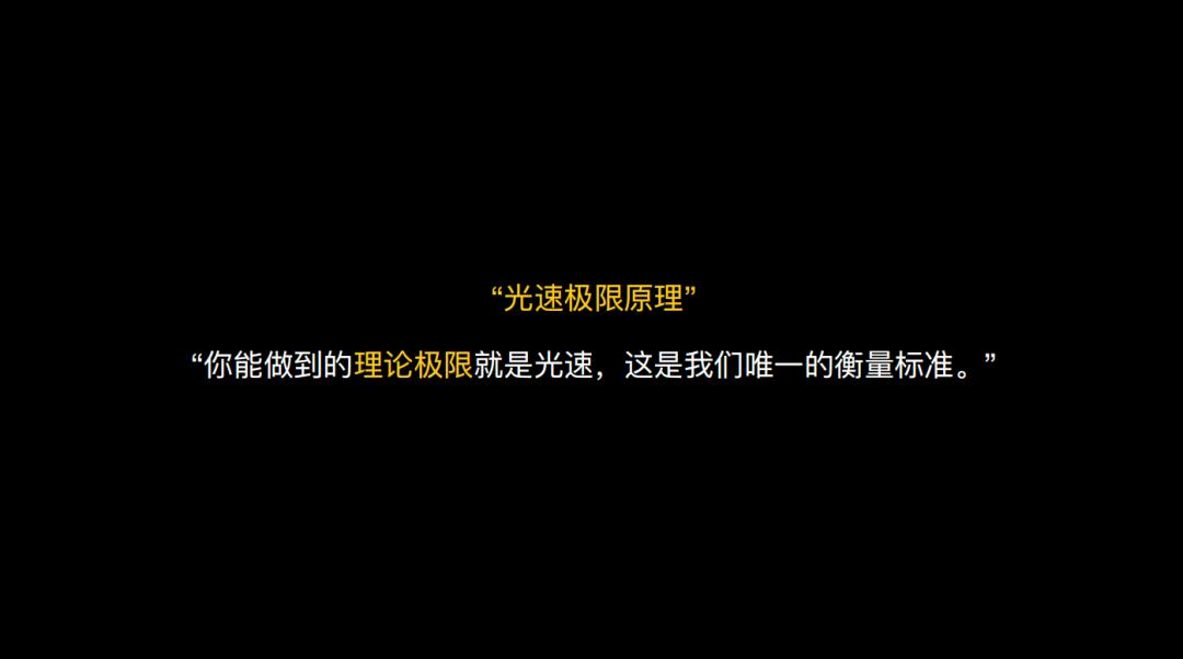 这条原则可以概括为:做任何一件事情,不要只问自己能否比过去的最好成绩再提高百分之多少,也不要问能比同行好多少;要直接问,这件事情在理论上的极限到底是什么。这是非常漂亮、也非常震撼的一种方法论。