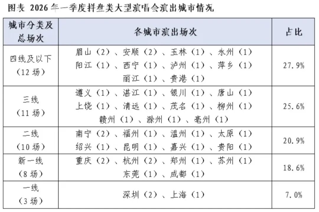 可以看到,Q1拼盘类演唱会资源持续向三四线及以下城市倾斜,其中四线及以下城市举办了12场,位居各线城市首位;三线城市也举办了多达11场,同比数量稳中有升。两者合计贡献超五成的拼盘演出,其对县域及周边区域文旅消费的拉动作用越来越不可小觑。