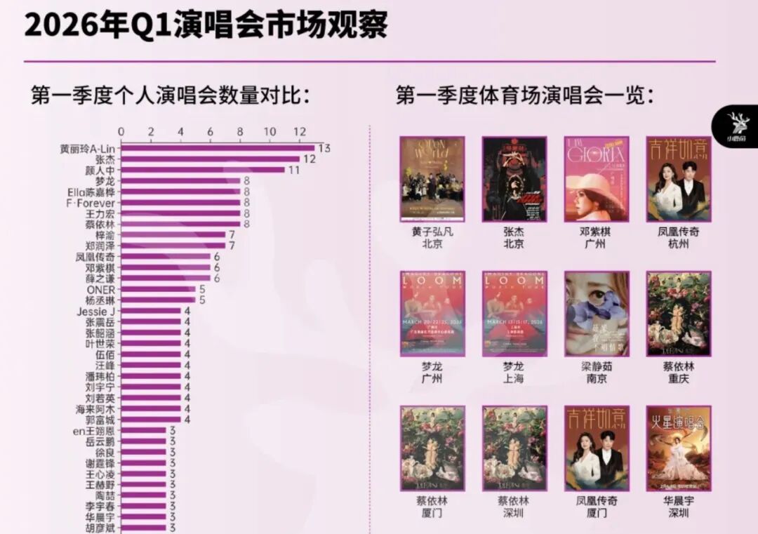 最引人注目的,当然是张杰的《未LIVE开往1982巡回演唱会》正在上演鸟巢十六连开的行业壮举(有些场次延到Q2)。然后是A-Lin黄丽玲,5城13场演出让她荣升为Q1最勤奋演唱会狂人。再然后是7城开了11场的颜人中,Q1已经开了8场的蔡依林、王力宏、Ella陈嘉桦等,Q1被安排了7场的郑润泽、梓渝,以及Q1一口吃下6场的薛之谦、邓紫棋、凤凰传奇等等。