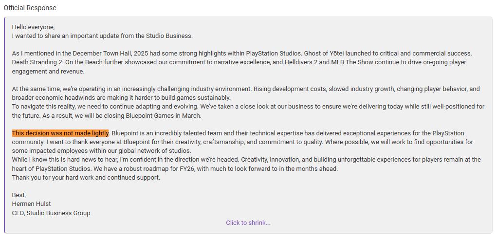 索尼近期也关闭了两家备受关注的工作室,其中最具代表性的是Bluepoint Games。这家以高质量重制产品闻名的工作室,曾为PlayStation带来了《恶魔之魂》《巨像之影》《神秘海域:内森·德雷克合集》等经典游戏的现代版本。然而,在2026年2月,索尼决定将其关闭,涉及70个岗位。