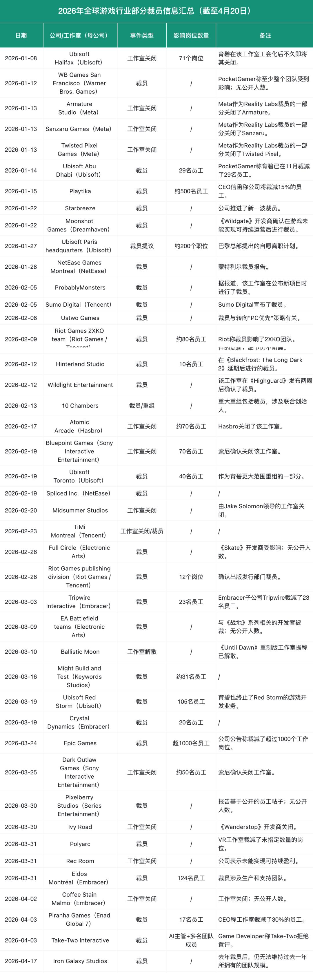 然而,以上所列举的案例,或许只是这场行业震荡的一角。据游戏那点事的不完全统计,截至2026年4月20日,全球已有至少44家公司或工作室传出裁员消息,影响人数超过2700人。数字背后,是行业整体步入转型阵痛的清晰信号。
