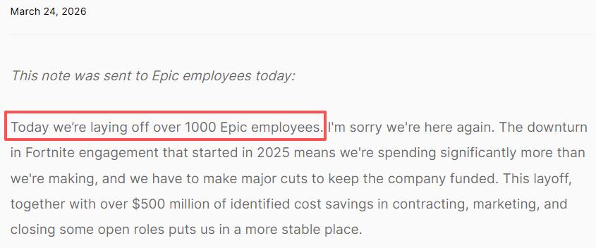 要说近期全球游戏行业的裁员动向,最引人关注的莫过于Epic Games。3月24日,Epic宣布裁员超过1000人,并特别强调此次裁员“与AI无关”。